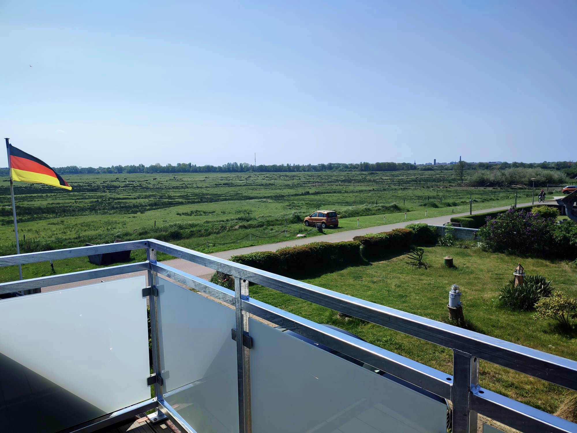mit Blick auf die Stadt mit dem neuen Leuchtturm liegt im ersten Stock der Pension und ist mit Dusche/WC und