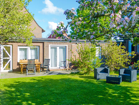 befindet sich im Garten der Pension und ist mit einem barrierefreien Bad und einer Küche mit Geschirrspüler, Mikrowelle, Kaffeemaschine und Kühl- und Gefrierschrank ausgestattet.