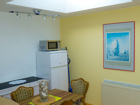 Des weiteren besitzt die Wohnung eine gemütliche Ess- u. Sitzecke und ein Fernseher. Kostenloser WLAN Zugang ist möglich und ein kostenfreier